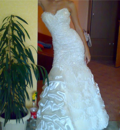 Продаю эффектное свадебное платье.Не венчано. Верх открыт,корсет украшен бисером,сзади на шнуровке. Цвет шампань.На рост 175-180.Размер 42-44.Очень подчеркивает фигуру.Возможен торг. |