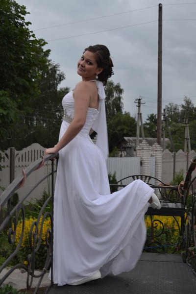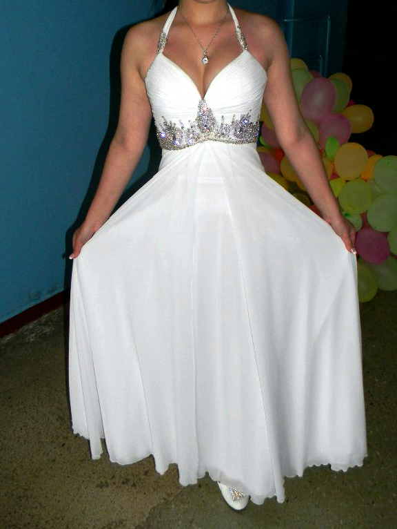 Платье белое,одевалось один раз.Подойдёт как выпускное,так и свадебное.Карсет обшит камнями,затягивается шнуровкой,хорошо сидит по талии.Возможен торг. |