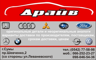 Магазин "Драйв" предлагает автозапчасти в наличии и под заказ. Оригинальные детали и их неоригинальные аналоги. Запчасти на китайцев. Б/У запчасти. По двигателю, ходовой, трансмиссии, оптика, электрика, радиаторы, кузовные детали. Аккумуляторы, шины, масла, тосол, антифриз. Предложения по фильтрам, ремням, тормозным дискам и колодкам. Пр. Шевченко 2, со стороны ул. Леваневского. [u]Т. 066 252 23 27; 098 046 54 36; 77 58 98. O662522327@ya.ru |