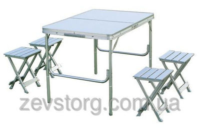 Отличный набор из складного стола и четырех стульев из алюминиевого сплава. В сложенном виде стулья находятся внутри стола, который принимает форму димломата с удобной ручкой. Длина ножек стола регулируется.