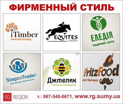 Разработка логотипа, создание фирменного стиля, бренд-бука. Дизайн полиграфии, наружной рекламы, рекламы на транспорте. Разработка упаковки для пищевой промышленности и хозяйственных товаров, тара, пакеты, коробки, футляры, этикетки и пр. ООО «Рекламная группа Регион» г. Сумы, ул. Гетмана Мазепы, 2 (0542) 79-7747 (050) 800-7747 (067) 800-7747 info@rg.sumy.ua www.rg.sumy.ua Мы делаем бизнес заметным, используя силу рекламных технологий. www.facebook.com/ooorgregion |