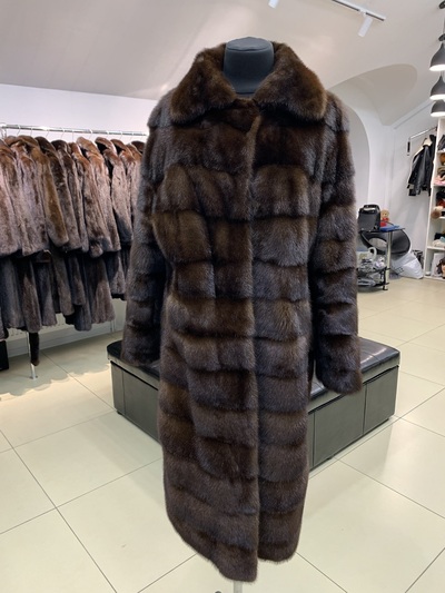 Элегантная норковая шуба натурального темно-коричневого окраса, разновидность махаон. Модель шубки френч, приталивается силуэт вшитой на талии кулисой, придавая образу утонченности и женственности. Шубка выполнена методом поперечного уклада цельных пластин норки без вставок. Рукава прямые длина 7/8. Воротник английский, можно дополнительно застегивать на скрытый крючок в шальку. Длина шубки 100 см. Шубка маленького размера, подходит на 38 40 42.